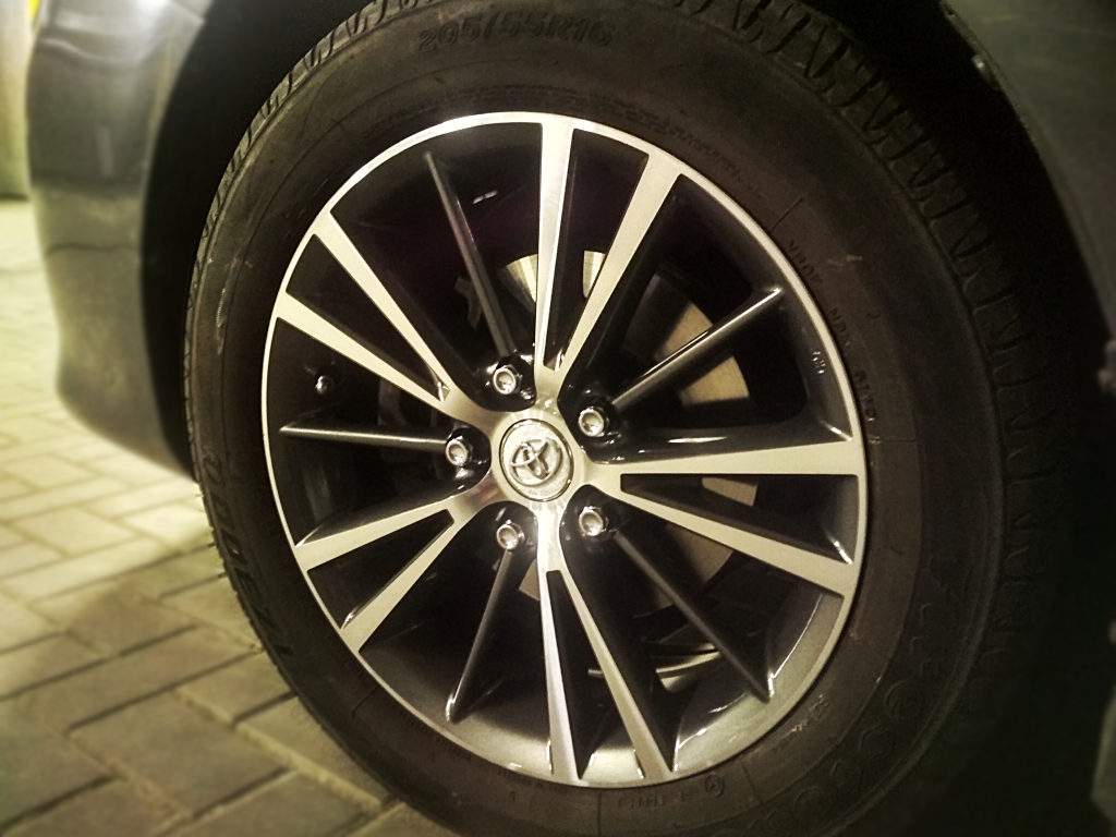 Felgi w środku są lakierowane na toyotowski grafit a na zewnątrz są polerowane, wygląda to naprawdę ładnie i pasuje do lakieru samochodu, dodatkowo dodają kapselki z logo Toyoty. Widać że felgi są wzorowane na obecnych (2018 rok) modelach alusów, które zakładają do aurisa, corolli i avensisa – czyli w środku lakier grafitowy, na zewnątrz polerka. Zobaczcie sami jak to wygląda.